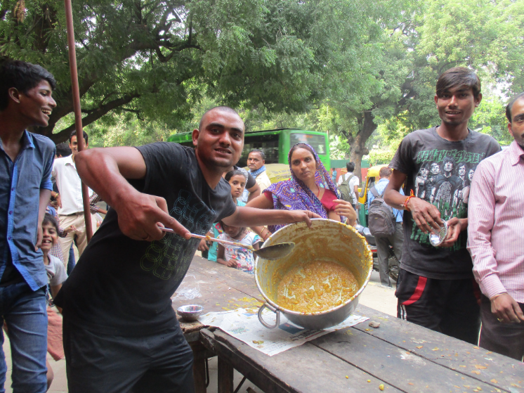 We get off the bus and there is a line of people being handed a plate of food. I suggest we get some, “no it is for poor people” Sheila has already figured out. Some people notice our reluctance and invite us to have some food. A plate of curry and a couple of too hot to hold puris and we are ushered to the only two chairs (they kick a couple of guys off) and while I am kind of used to Honoured Guest status, Sheila gets initiated.
